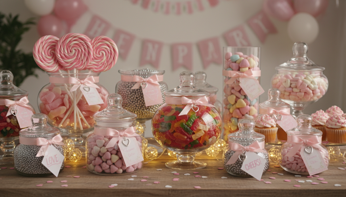 The display is laid out with care to make it both eye‑catching and interactive, encouraging guests to dip in, share their favourites, and enjoy a little sugar boost throughout the celebration. Every element is chosen to help create a fun, celebratory atmosphere for the bride-to-be and her closest friends.